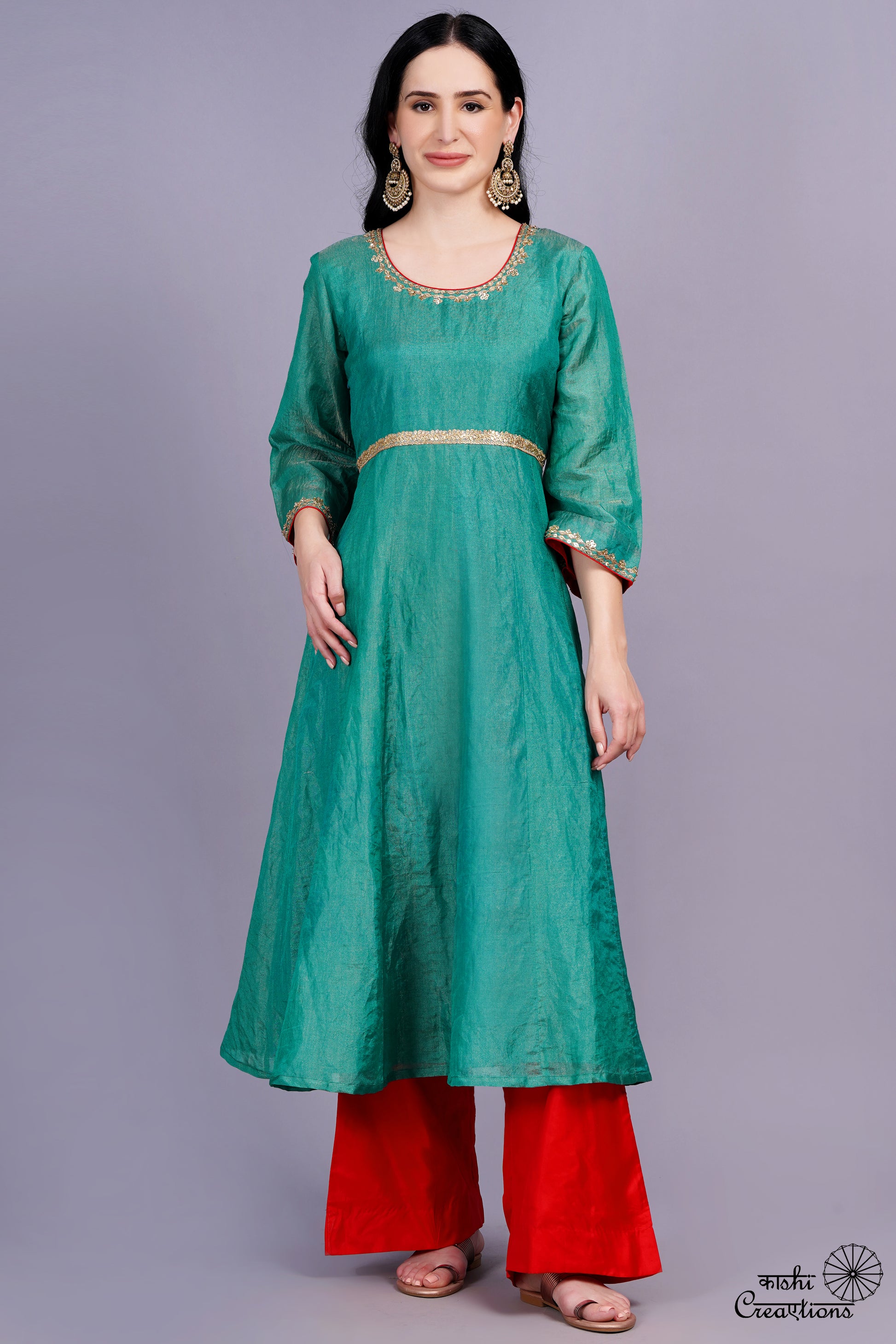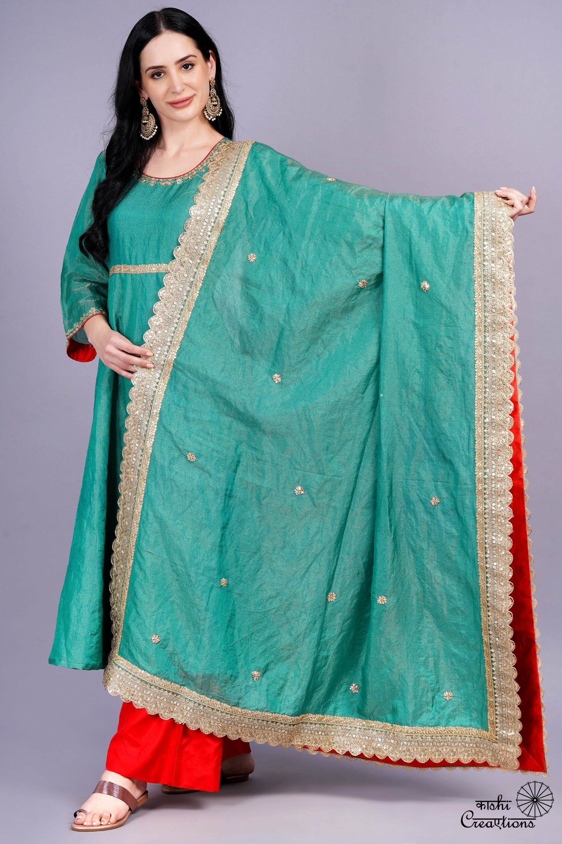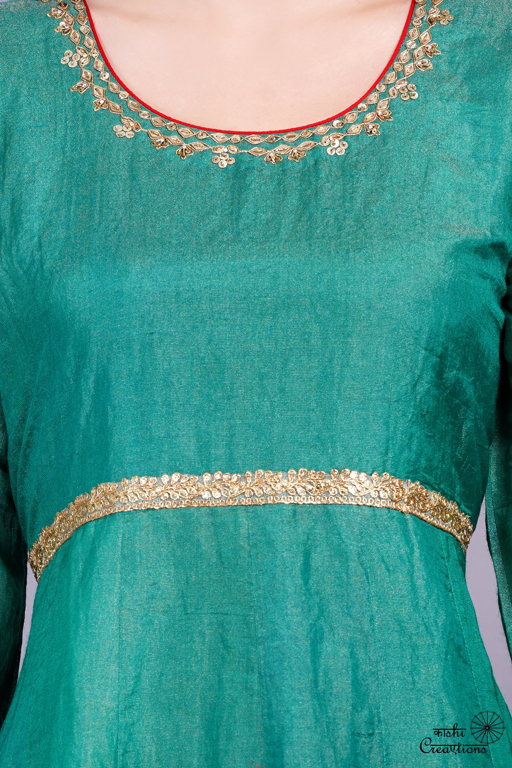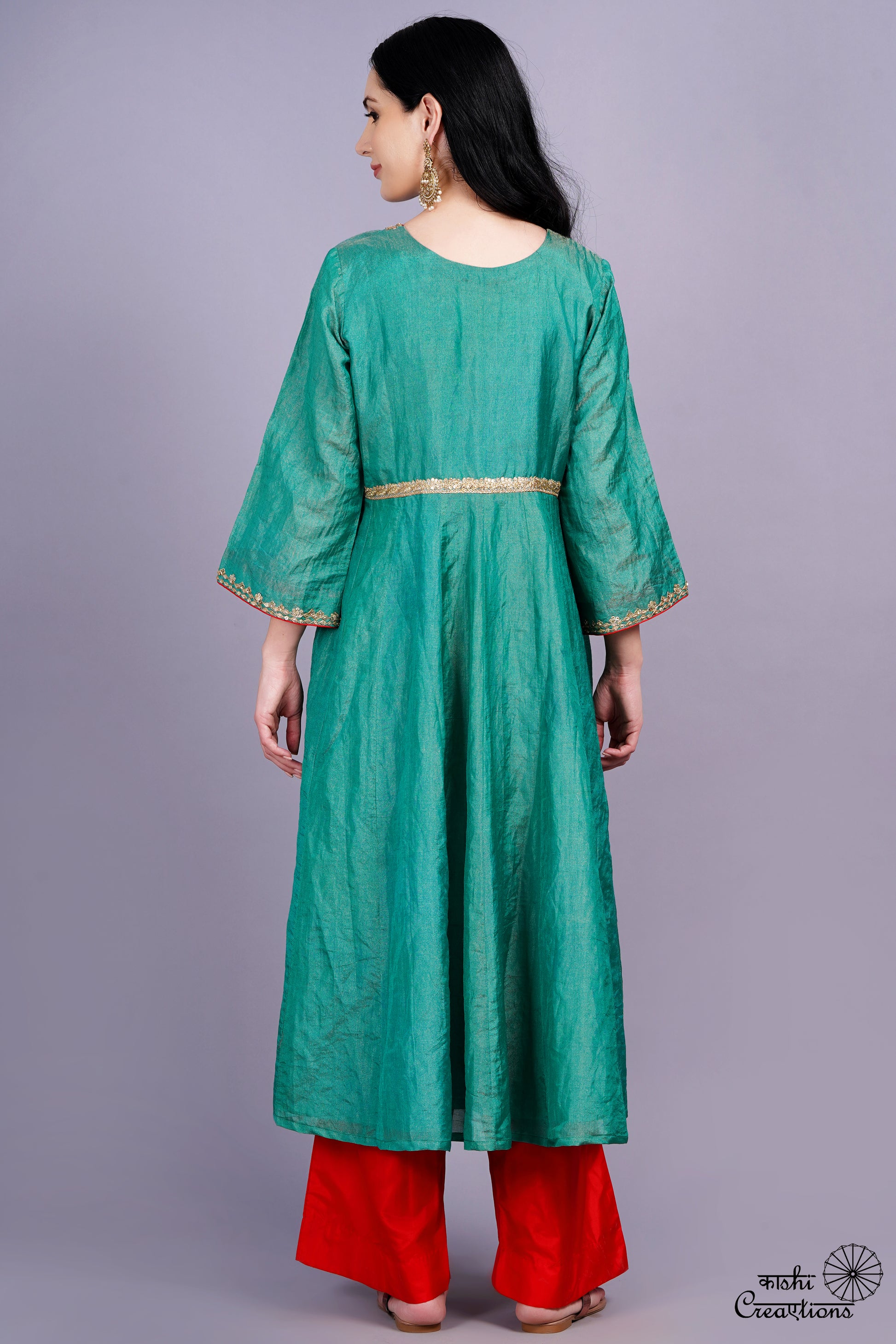 Emerald Green and Red Pure Tissue Silk Anarkali Suit Set