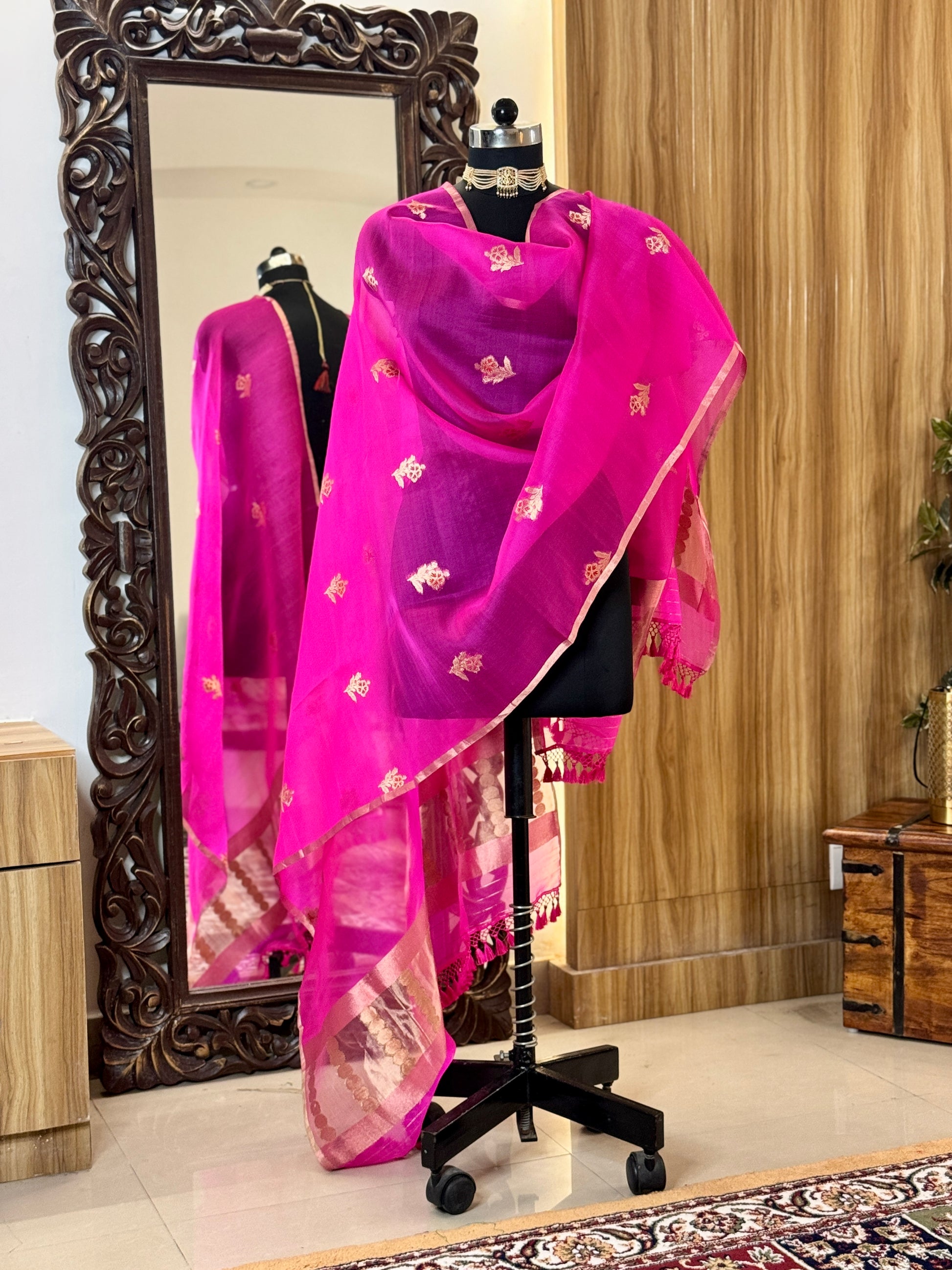 Fuchsia Pink Pure Kora Silk Handwoven Dupatta