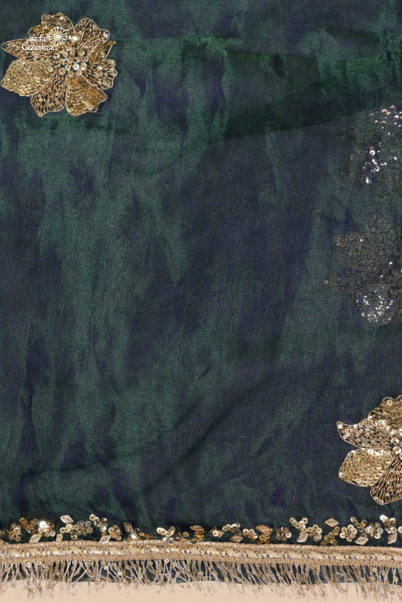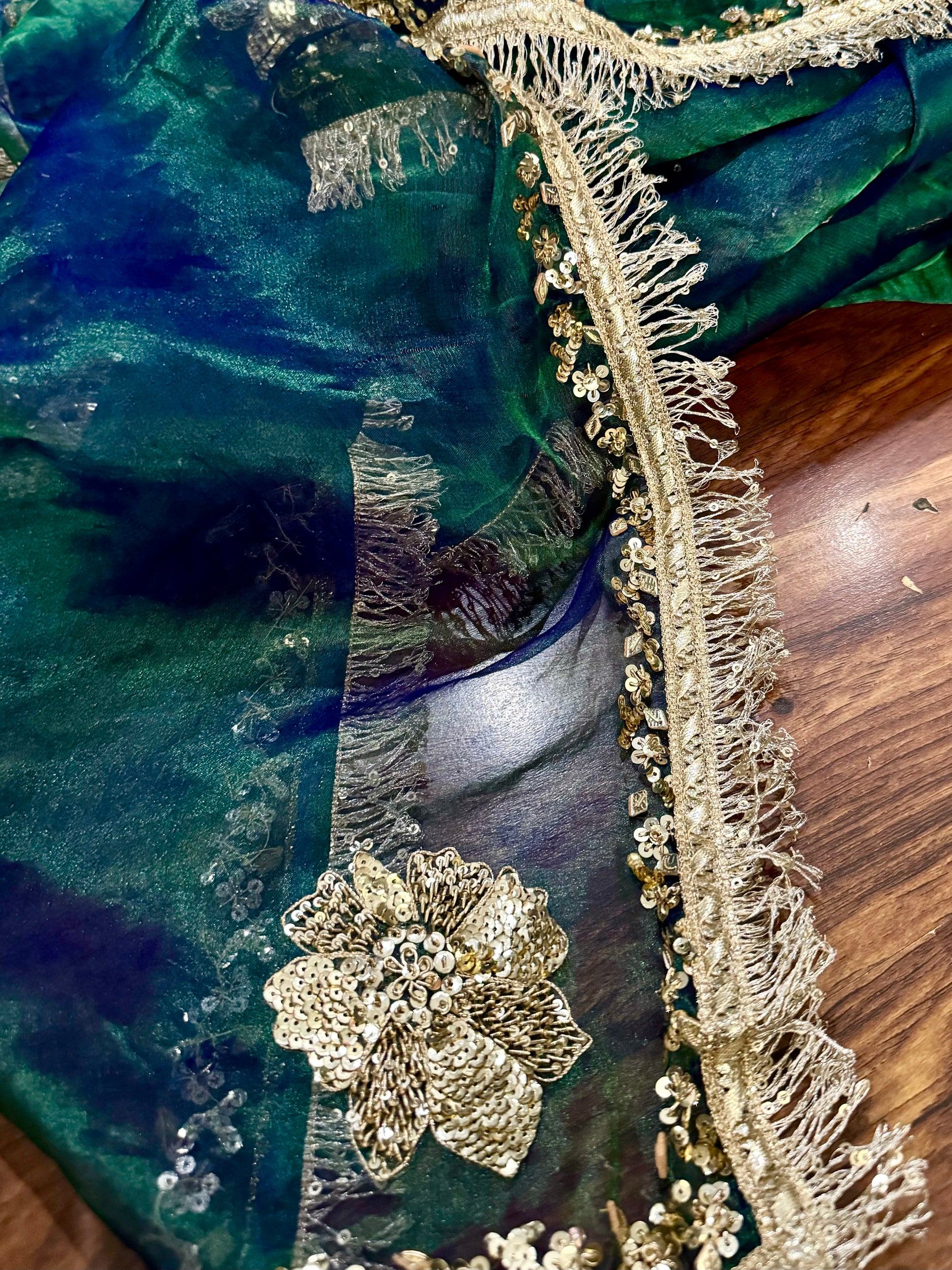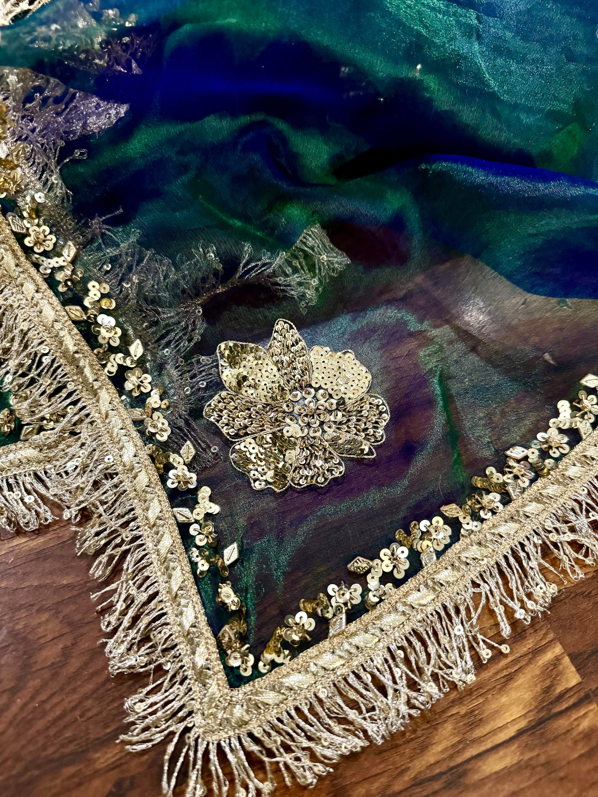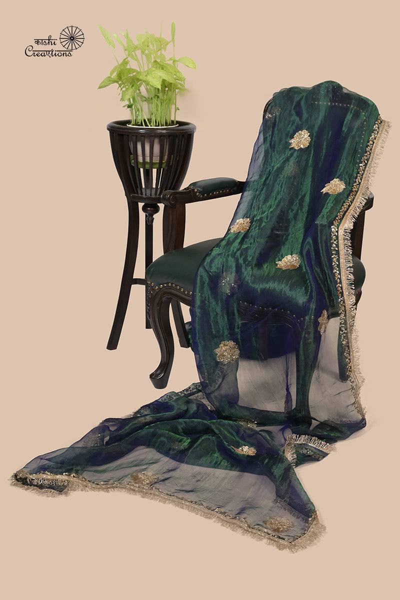 This stunning saree is a masterpiece in pure tissue silk, handwoven with love and care. It features a mesmerizing blend of green and blue hues, which give it a luxurious and ethereal feel. The shimmering fabric exudes sophistication, making it perfect for special occasions and celebrations.
