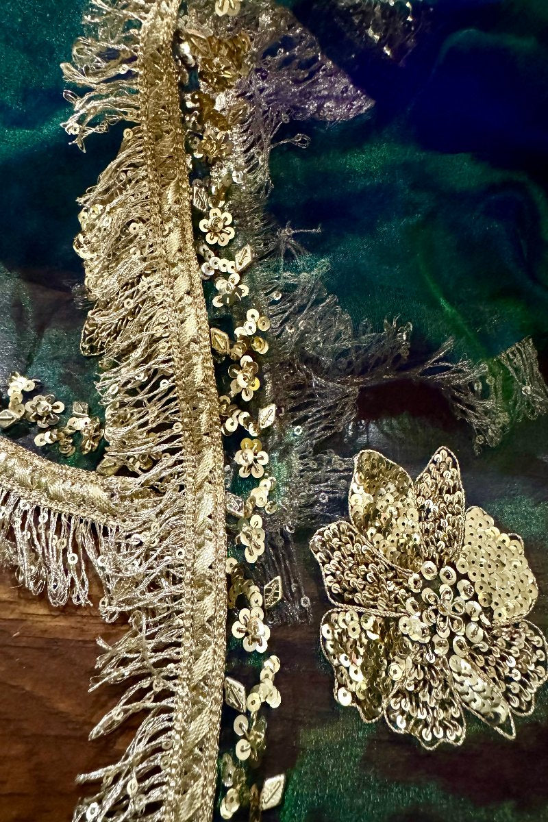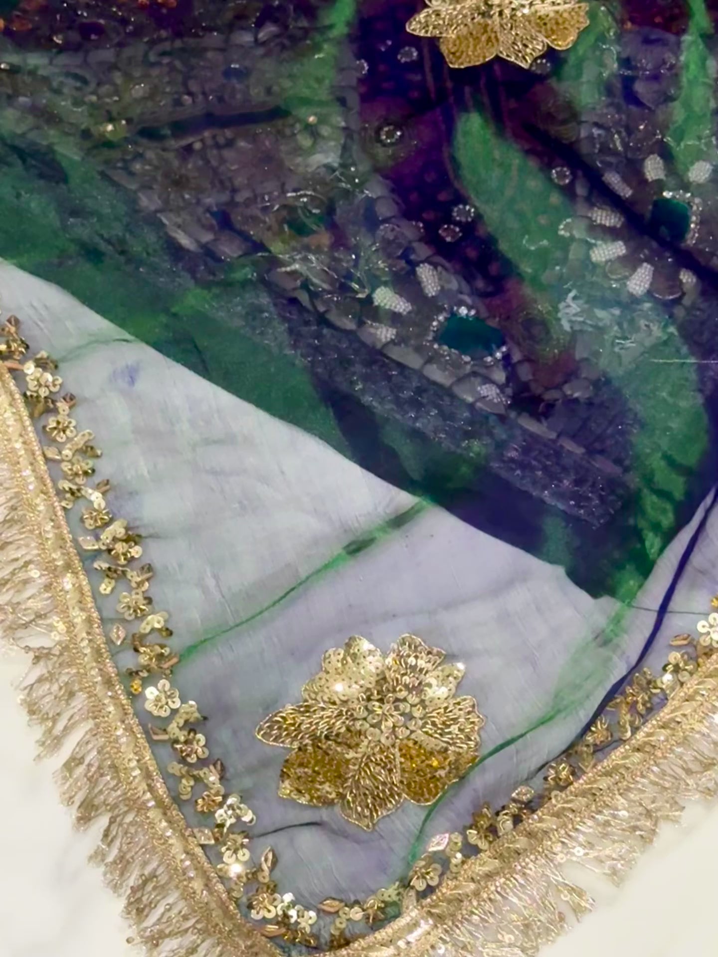 Intricate handwork embellishes the saree with traditional dabka, sequin, and beadwork, each detail reflecting fine craftsmanship. The embroidery gracefully cascades along the borders and pallu, adding depth and a regal touch. The saree’s delicately woven handloom fabric enhances its rich texture and luminous sheen, capturing the essence of traditional artistry.