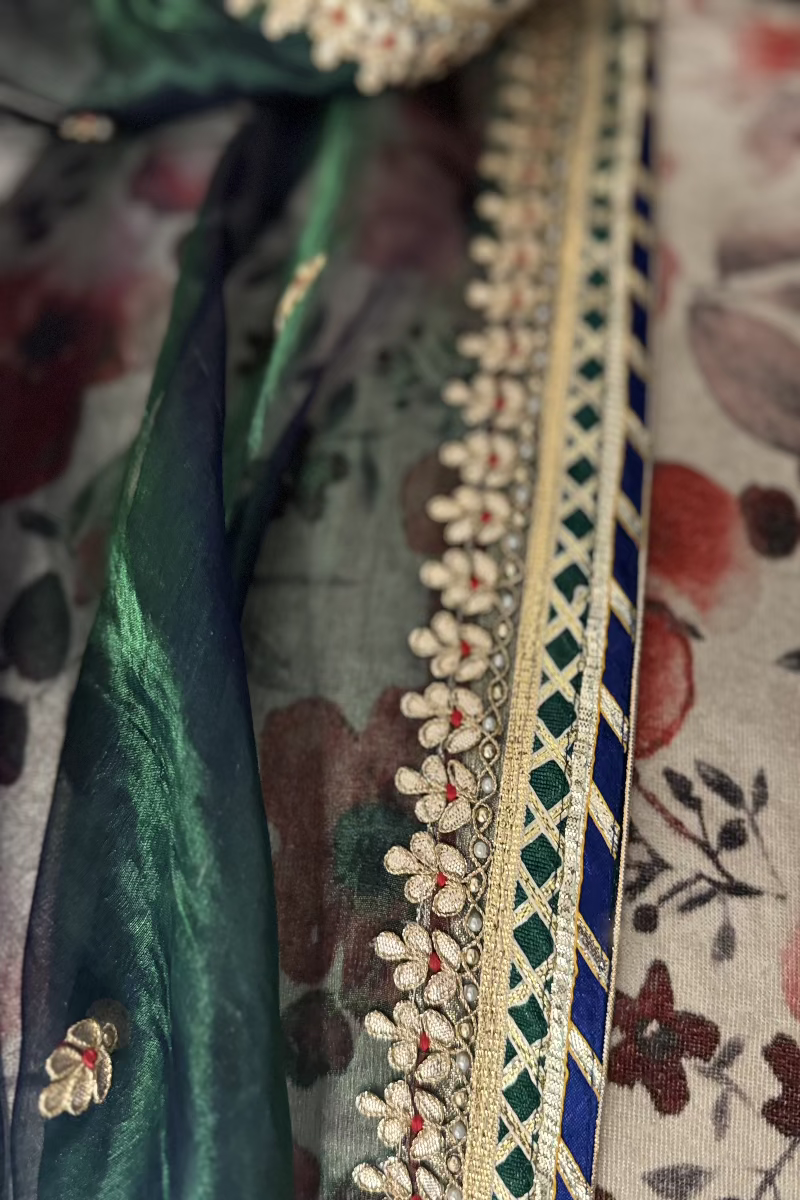 This stunning dupatta is crafted from pure tissue silk, which gives it a luxurious and lustrous finish. The fabric itself is handwoven, ensuring a high level of craftsmanship and attention to detail. The highlight of this piece is the intricate handwork done using traditional techniques such as gota patti, pearl, and dabka embroidery. Each element has been meticulously placed by skilled artisans, adding a touch of opulence to the design.