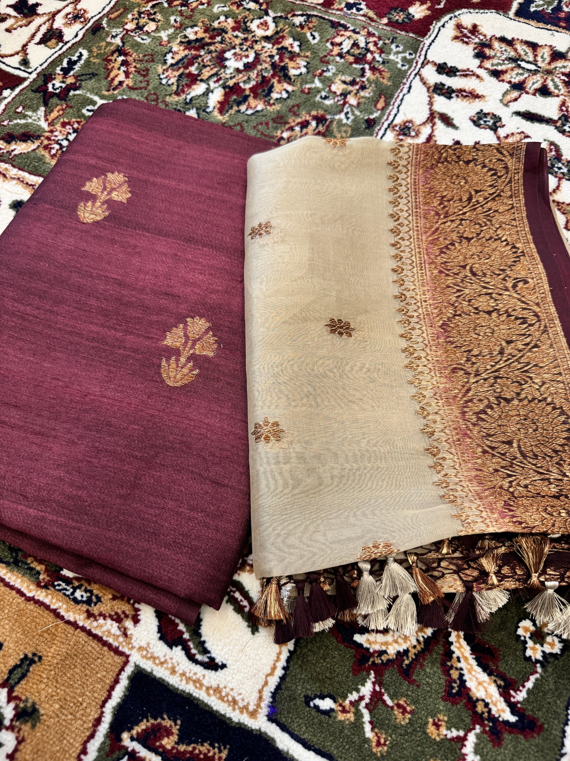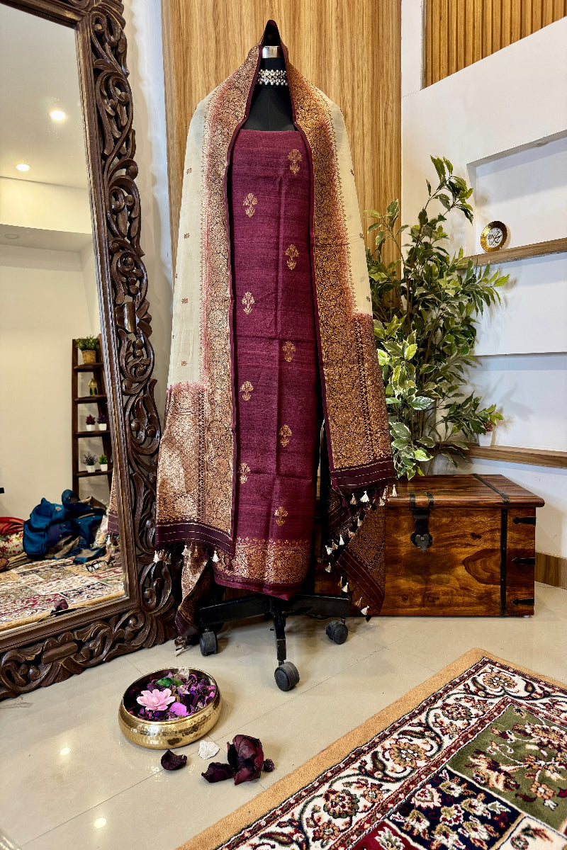 Wine Color Pure Tussar Silk Handloom Suit Set with Kora Silk Dupatta