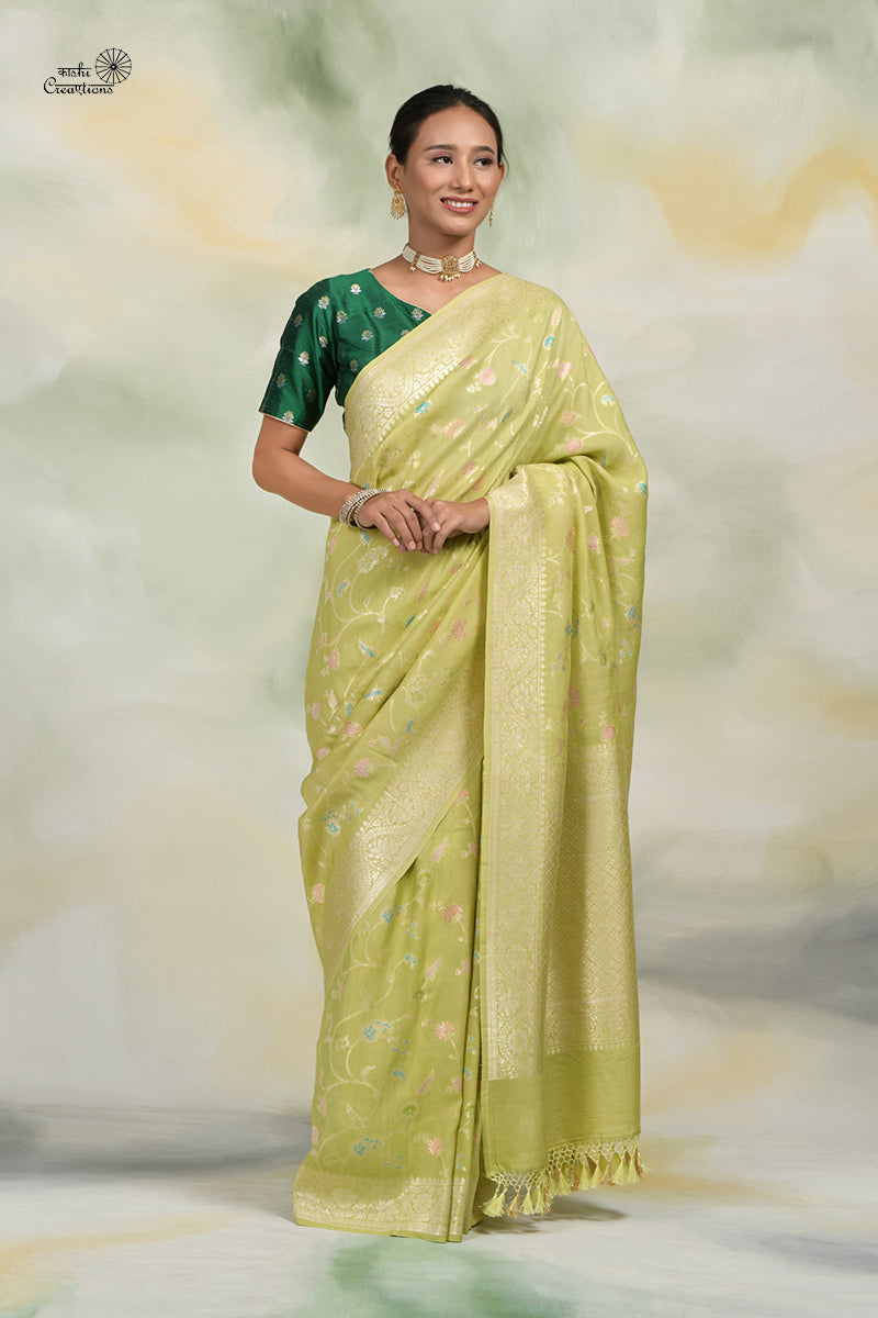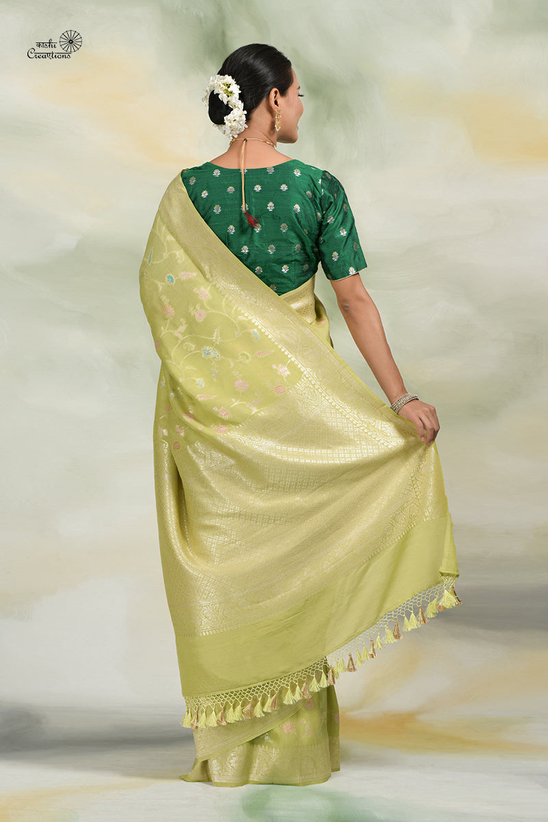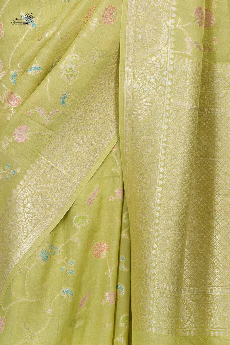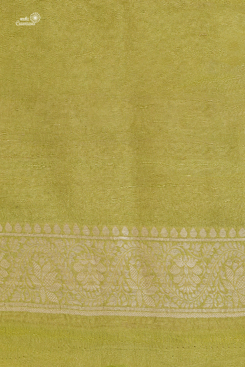 Light Parrot Green Pure Tussar Georgette Handloom Bnarasi Saree