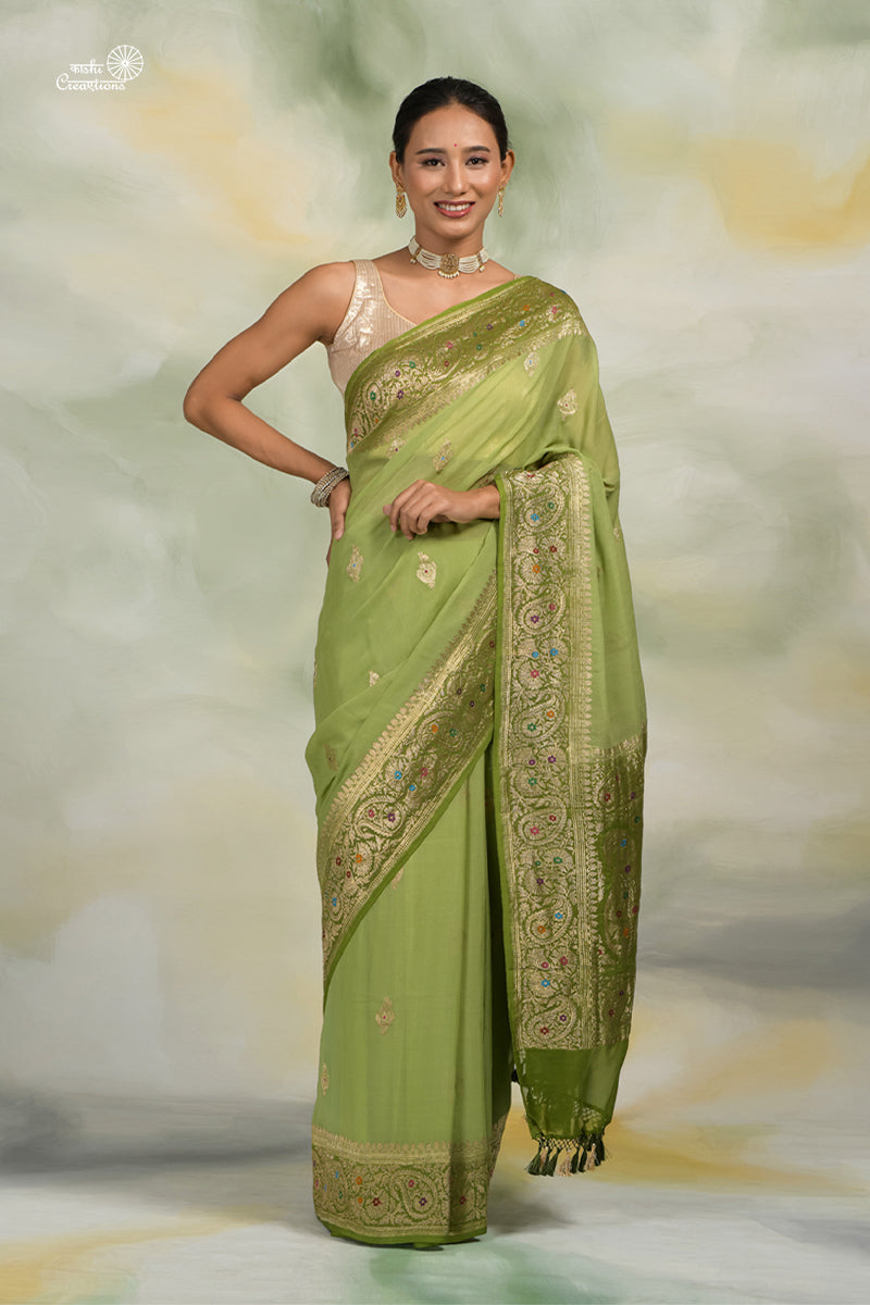 Light and Dark Mehndi Green Shaded Chiffon Georgette Hnadloom Banarasi with Meenakari