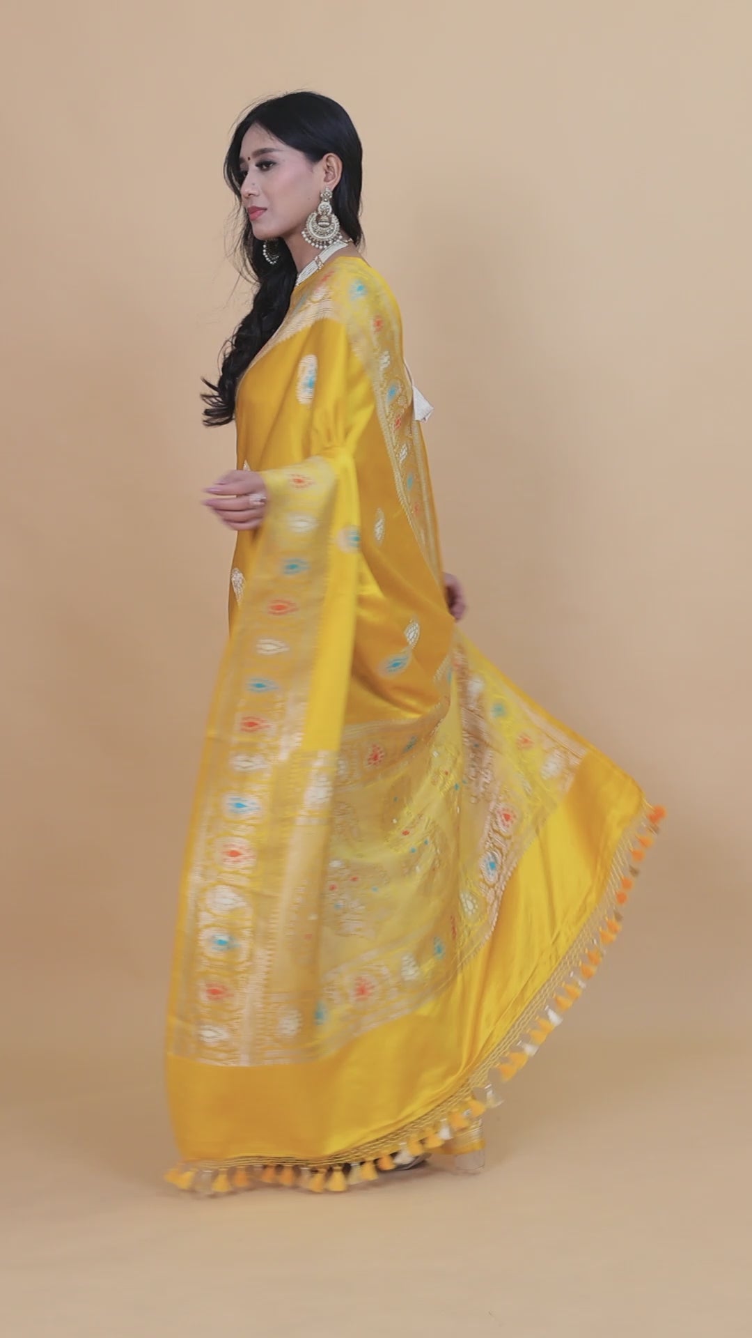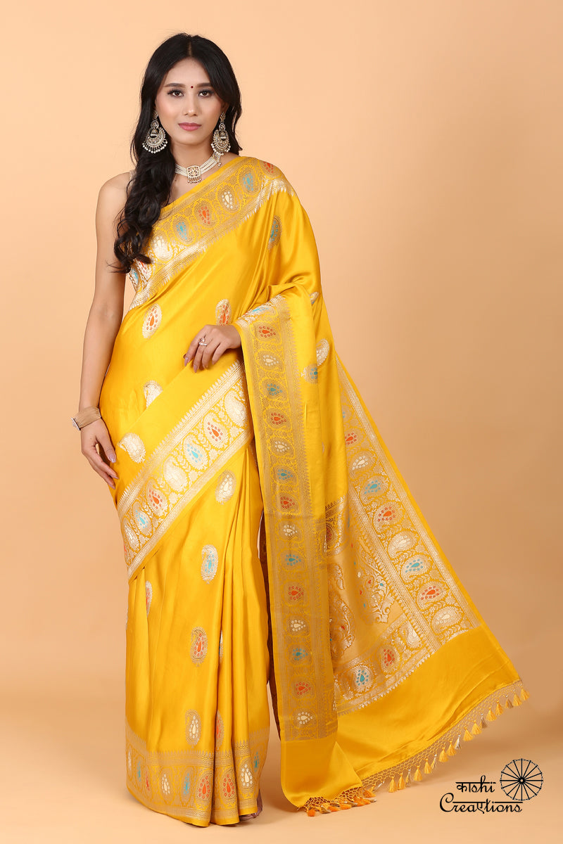 Mustard Yellow Pure Mashru Satin Silk Handwoven Banarasi Saree with khadwa boota border and Meenakari. Its an elegant classic handwoven luxury. A gorgeous and stunning saree for this festive and wedding season, a must for your wardrobe . The soft satin silky feel of the saree will make you fall in love with this saree. Its a luxury to be passed on to generations. Beautiful gold boota and border and breathtaking pallu with beautiful Meenakari gives you the best of Indian weaving. Straight from the lanes of bananas to the world. If you are handloom lover , its an absolute buy.