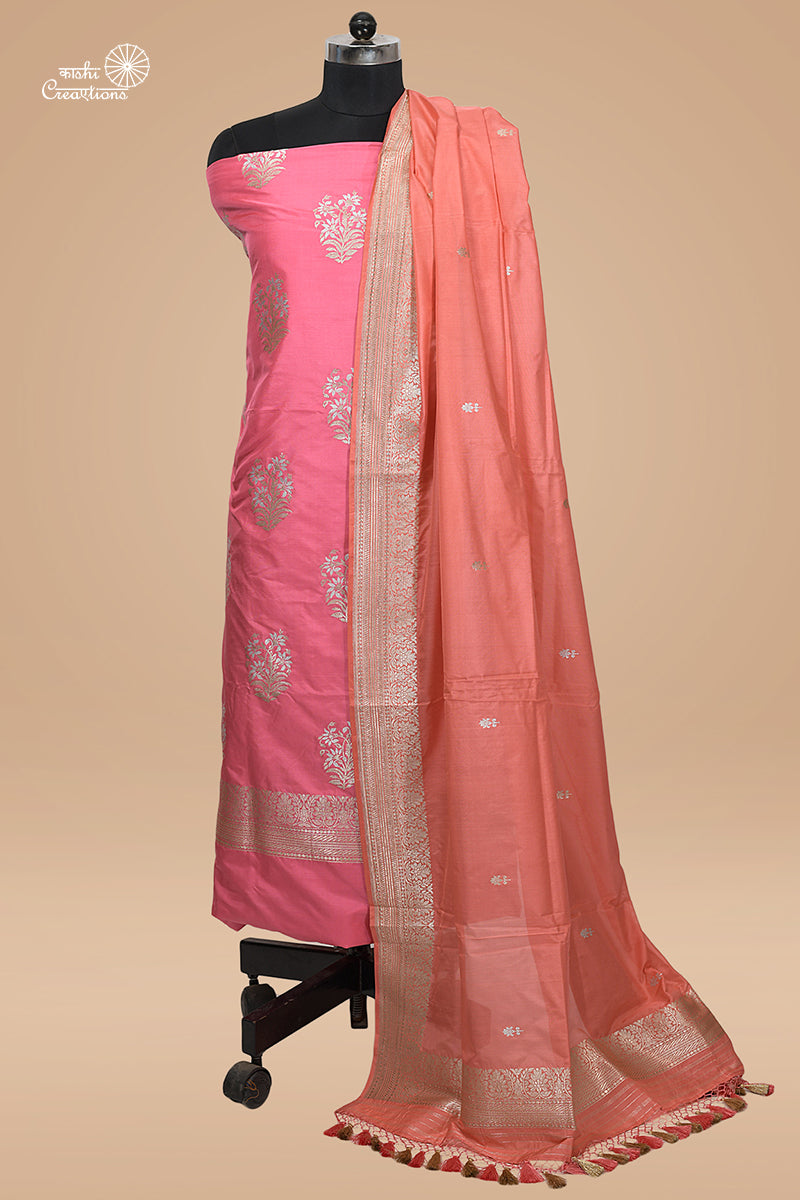 Rough Pink and Coral Peach Pure katan Silk Handloom Banarasi Suit