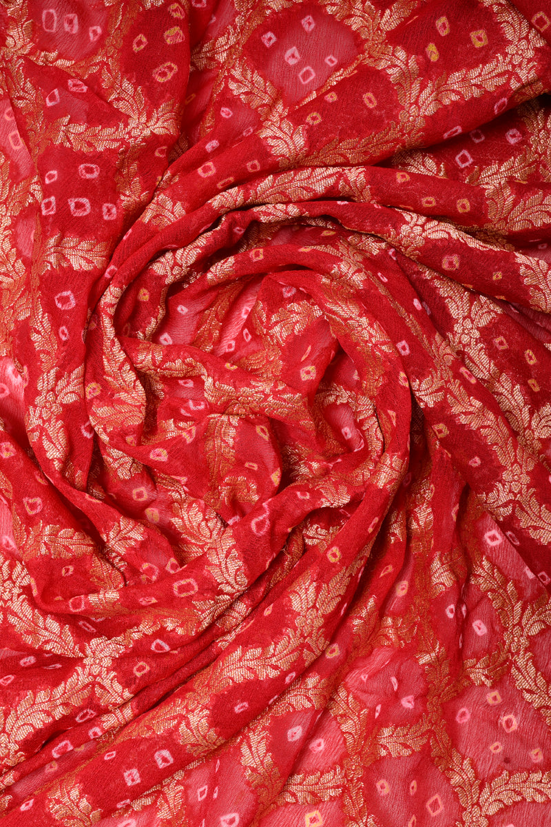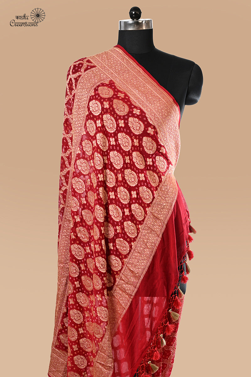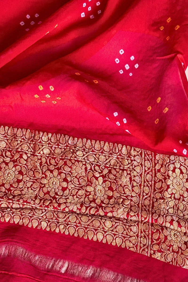 Red Pure Khaddi Georgette Banarasi Bandhej Handwoven Saree