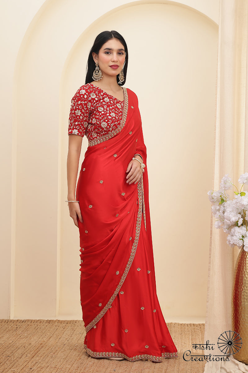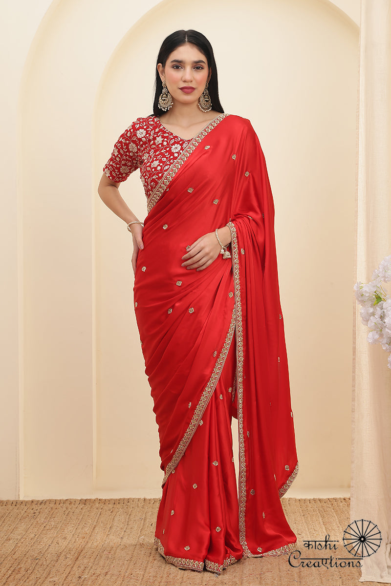 This stunning Red Satin Silk Saree is a perfect blend of luxury and tradition. Handwoven in Banaras, the rich satin silk fabric features an elegant Mashru weave that gives it a soft sheen and graceful fall. The saree is beautifully enhanced with very delicate hand embroidery of Royal Zardozi work adding a touch of timeless charm and sophistication. Ideal for weddings and special occasions, this masterpiece reflects fine craftsmanship and royal elegance in every thread.