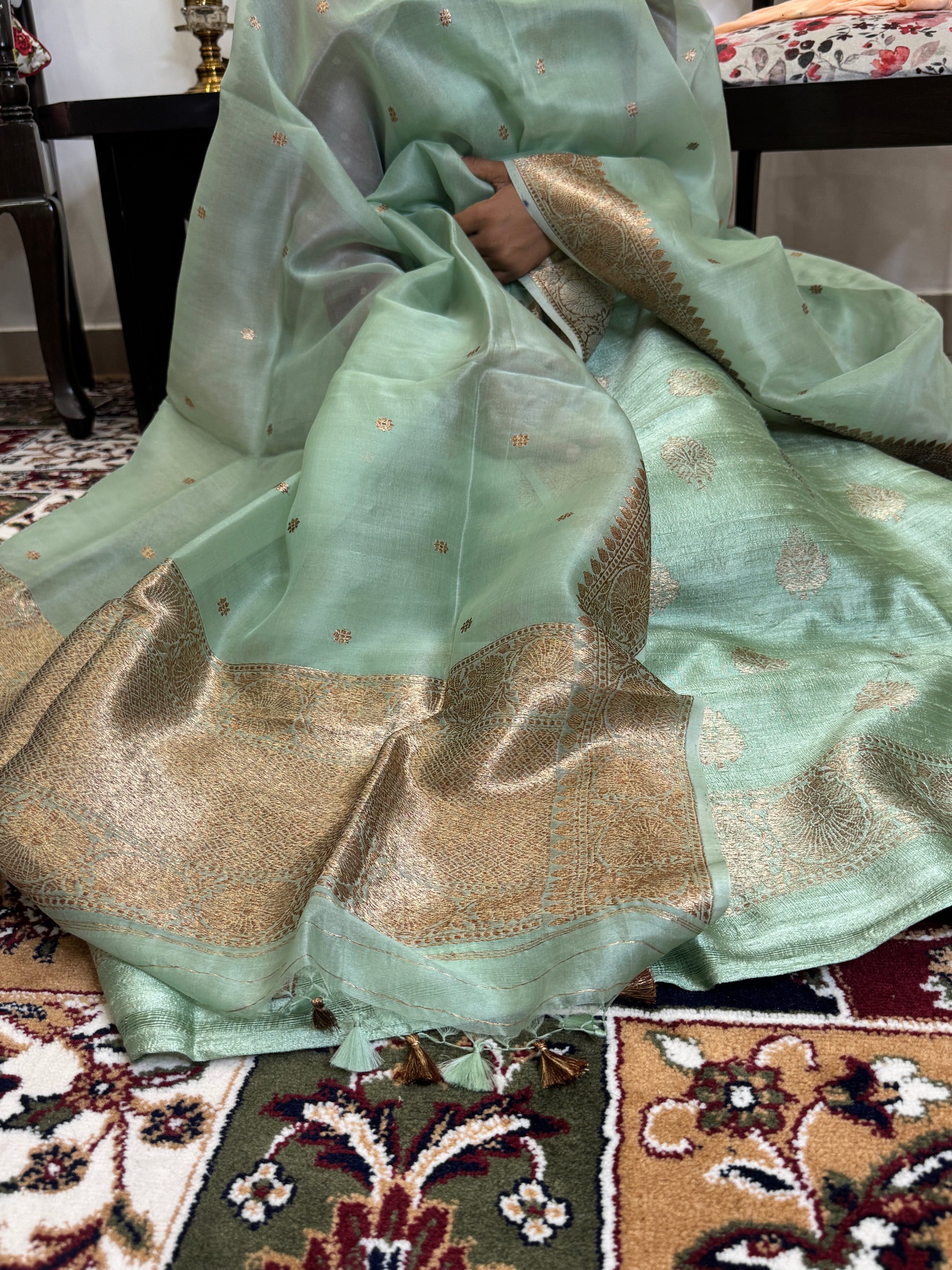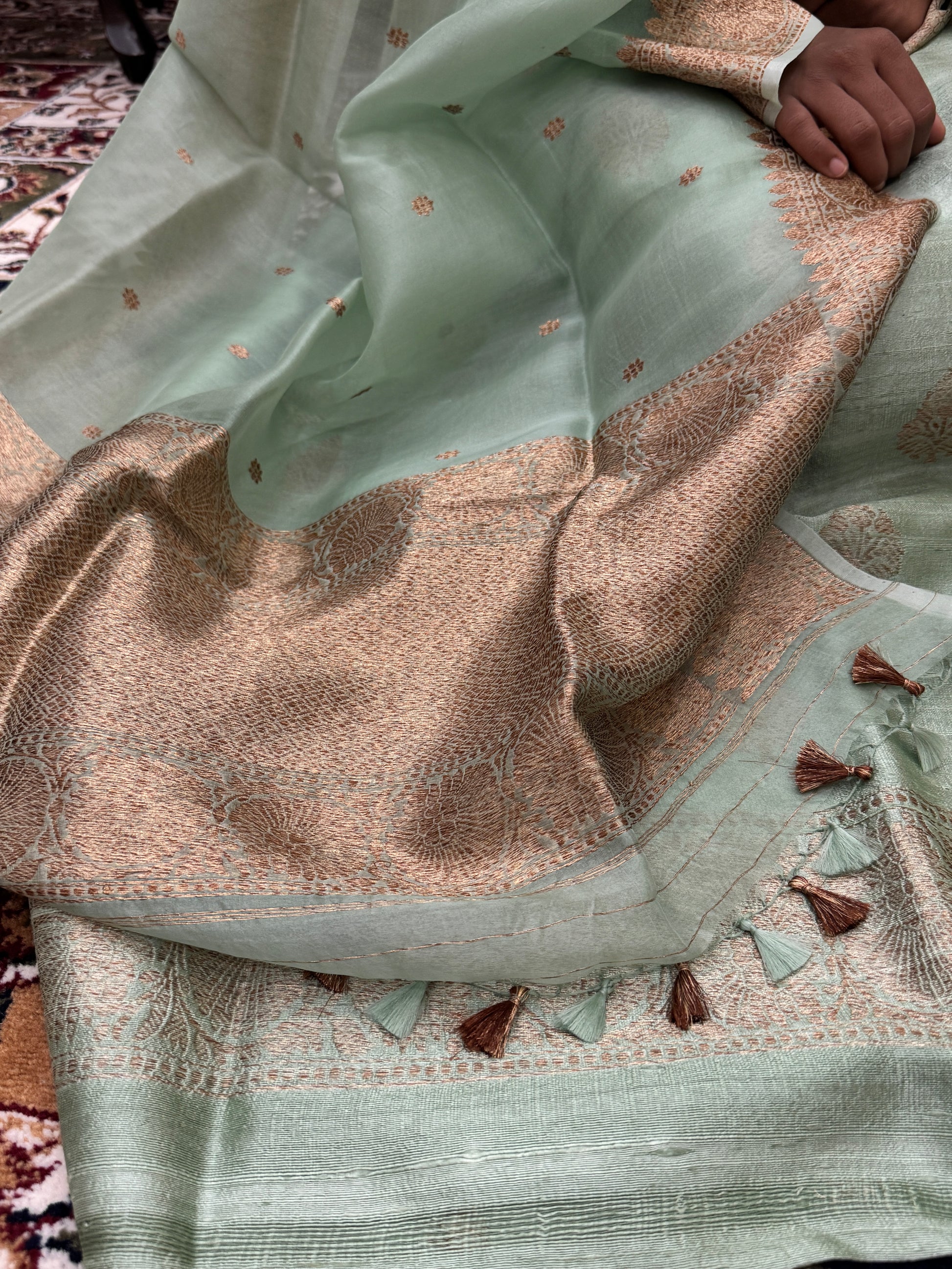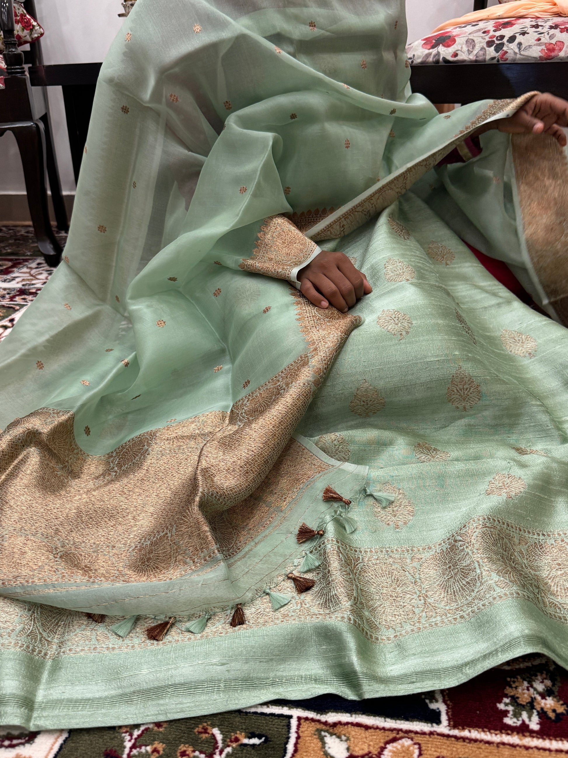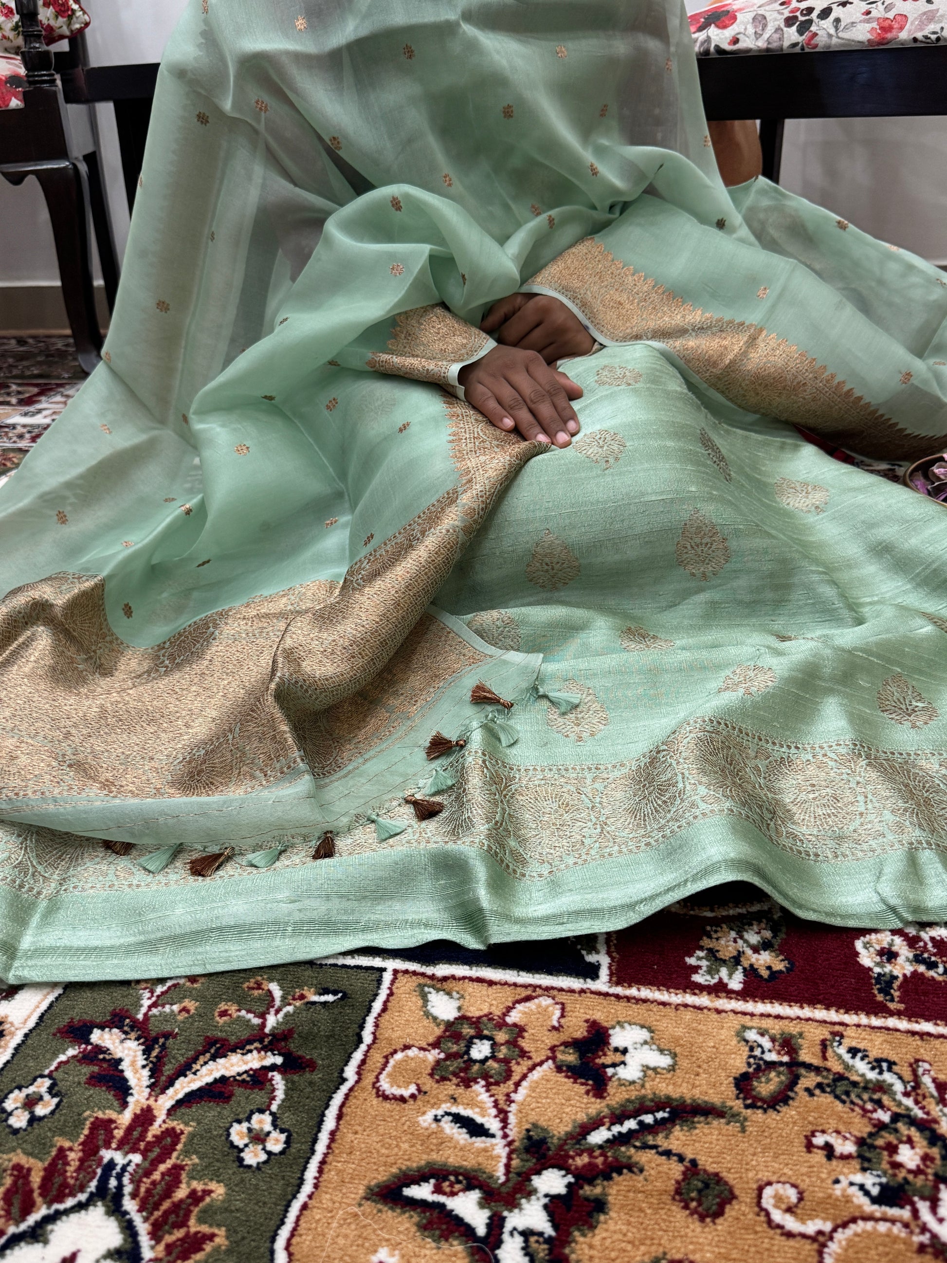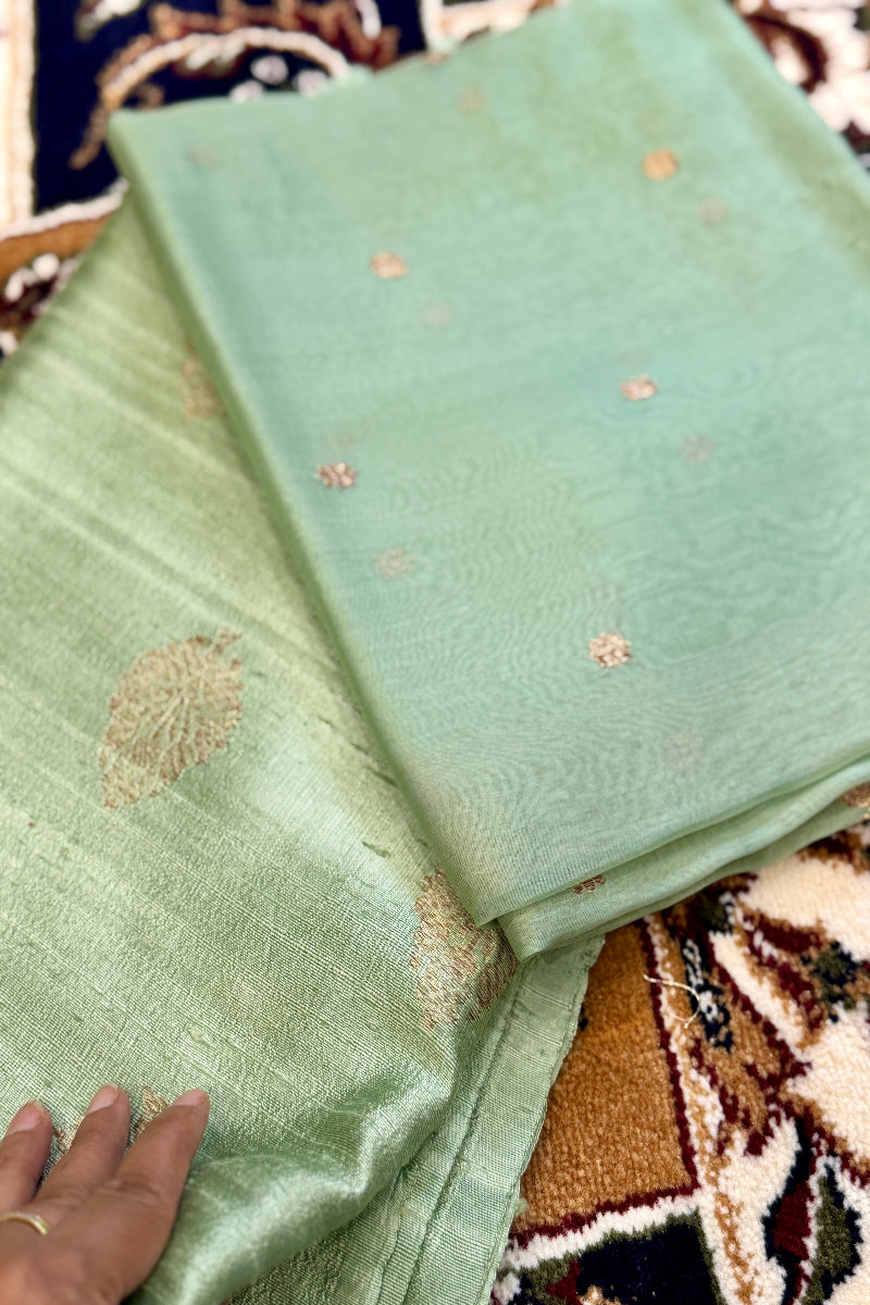 Sage Green Pure Raw Silk Khadwa suit with beautiful khadwa border and buti Kora Silk Dupatta . Its a beautiful traditional banarasi suit, good for all occasions. A beautiful Gift from the weavers of Holy City of Banaras to the whole world.