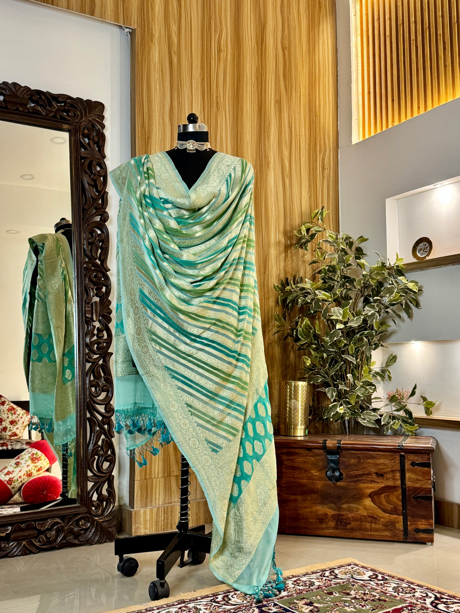 Envelop yourself in the luxurious radiance of our watermelon Sea Green Pure Khaddi Georgette Silk Handloom Banarasi Dupatta, a true masterpiece that embodies the opulence and artistry of Indian textiles. This exquisite piece is adorned with a mesmerizing blend of cutwork leheriys , timeless symbol of elegance and heritage.