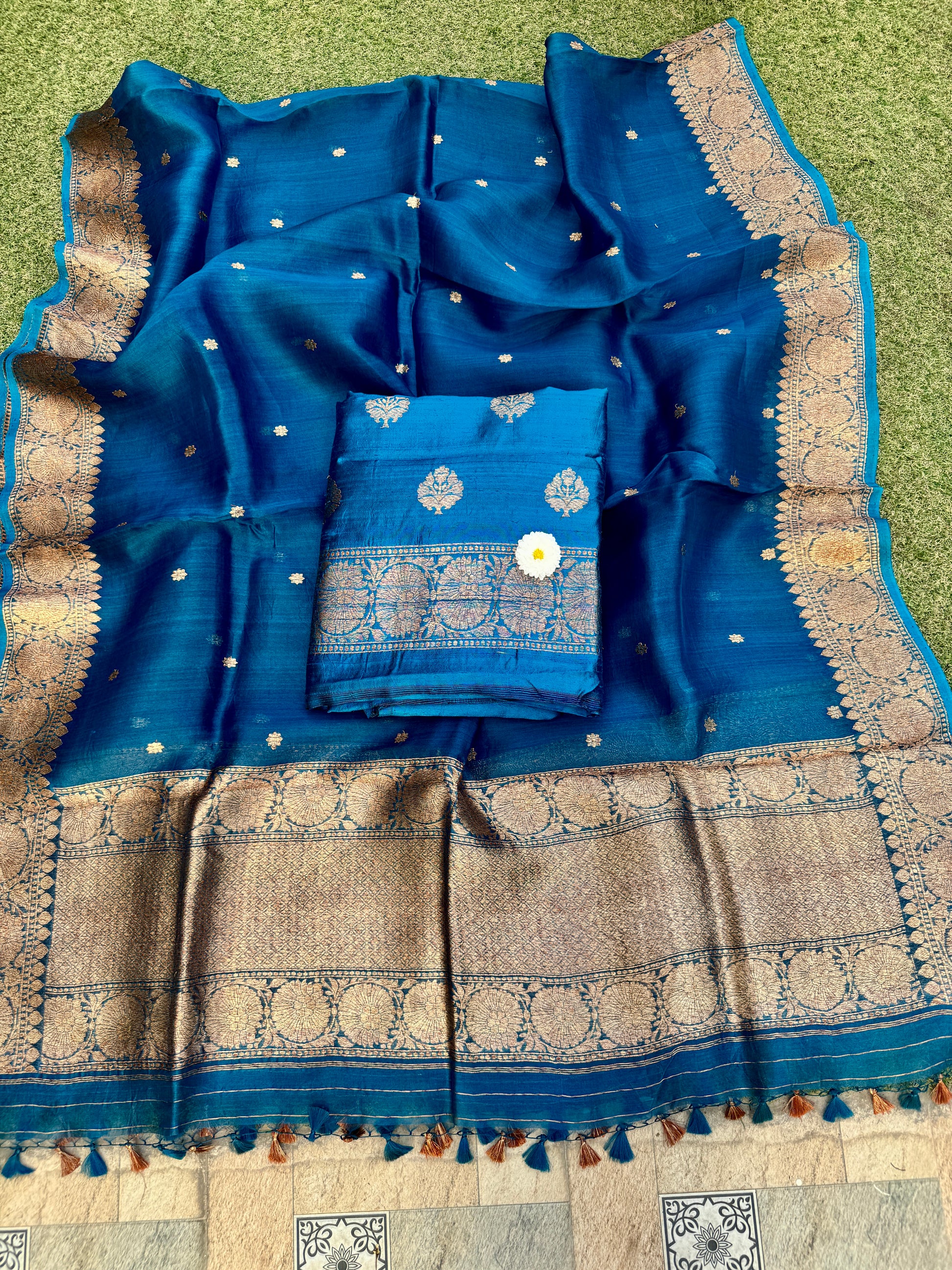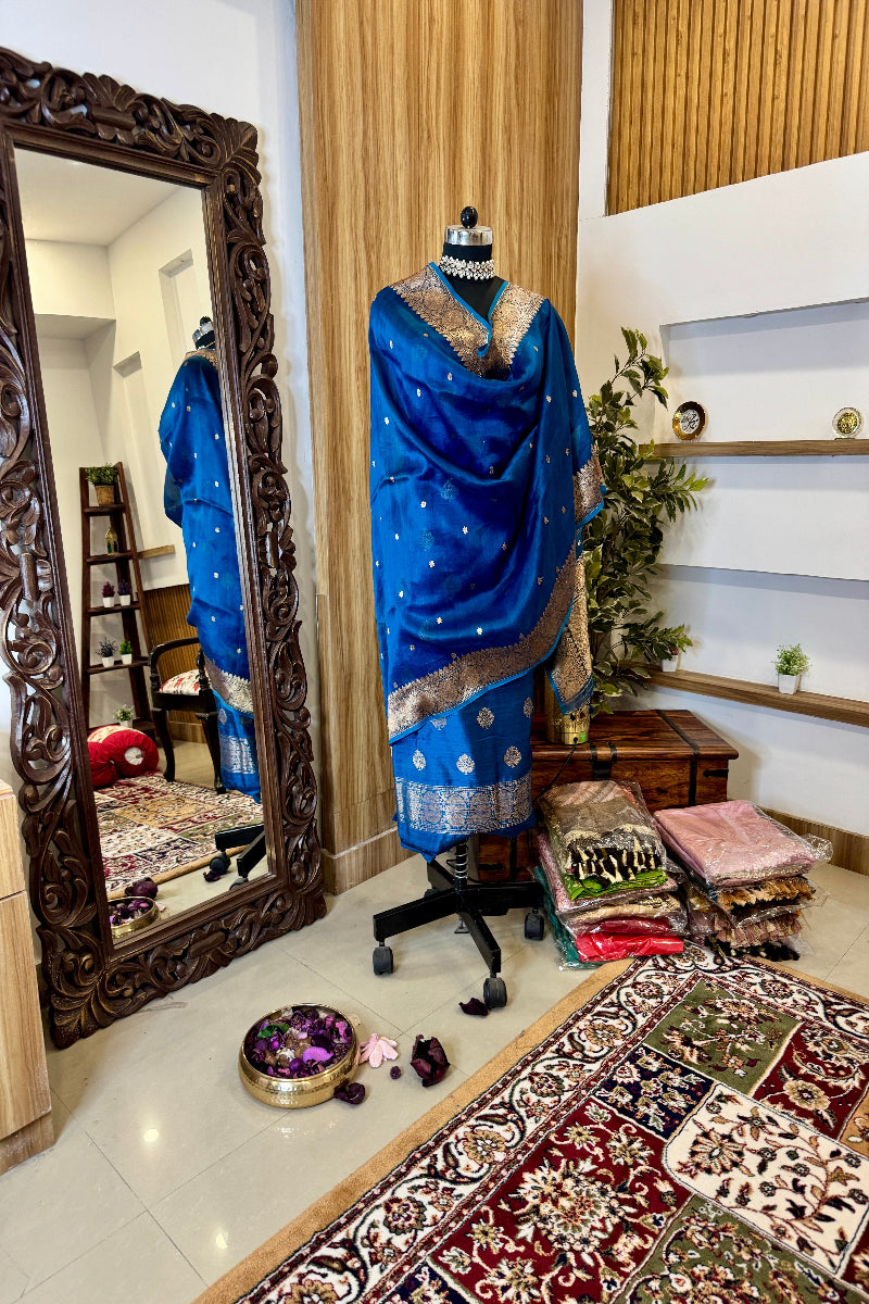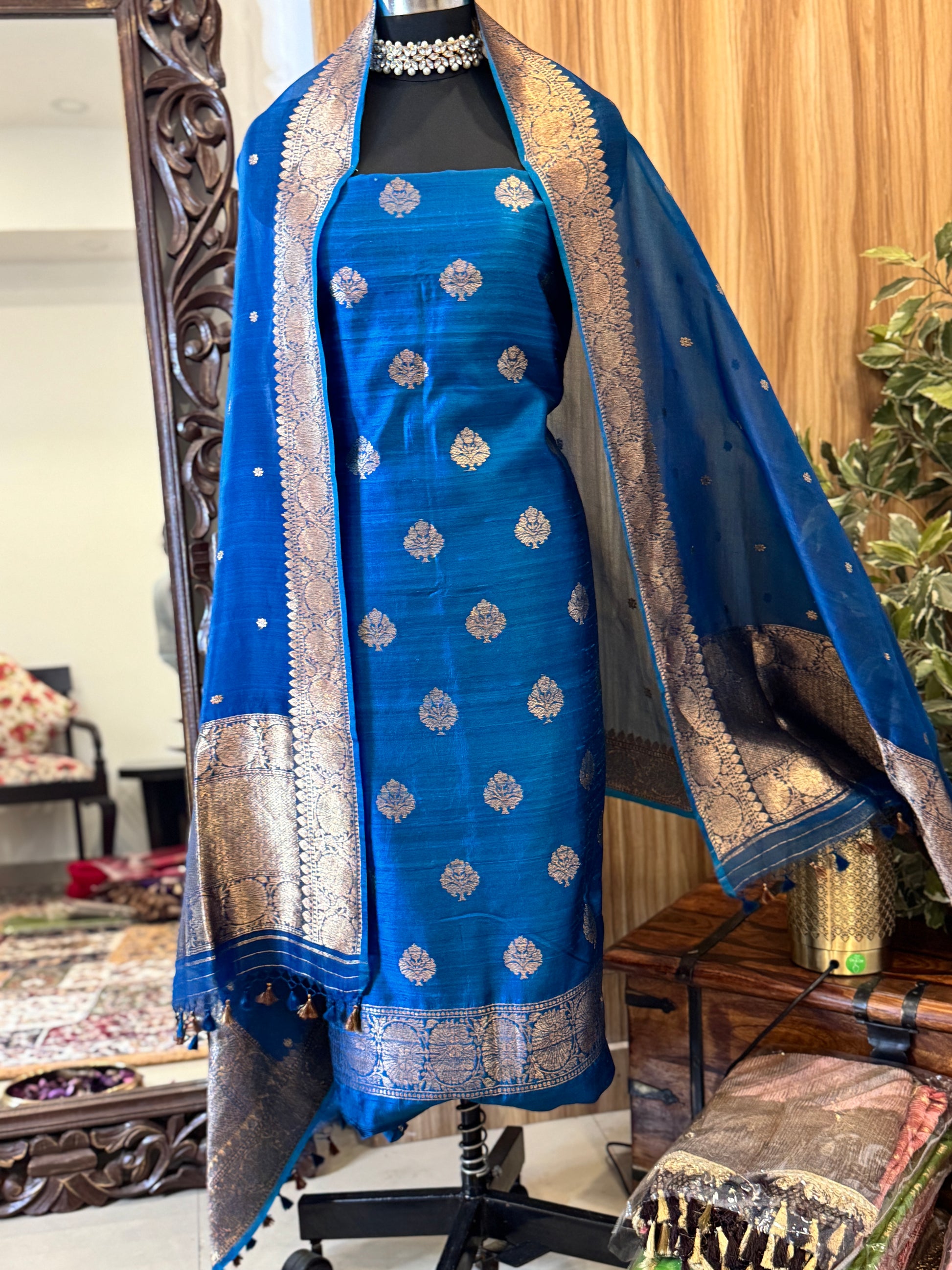 Teal Blue Pure Raw Silk Khadwa suit with beautiful khadwa border and buti Kora Silk Dupatta . Its a beautiful traditional banarasi suit, good for all occasions. A beautiful Gift from the weavers of Holy City of Banaras to the whole world.